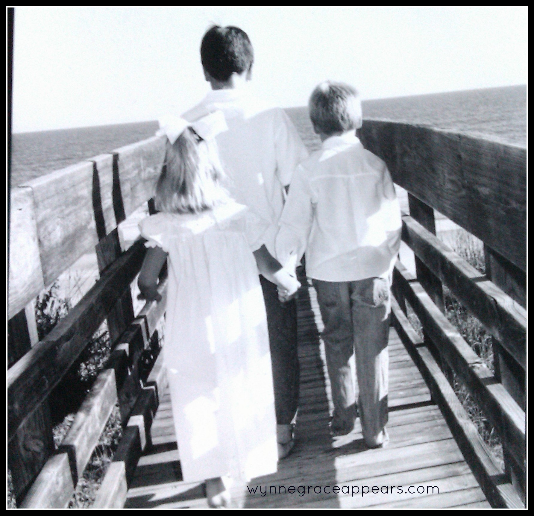 But the back turned, facing away, toward the sea.  Turned away.  Turned from me. Its what I see as beauty. The head down looking on the path.  Avoiding splinters in the barefeet.  Or avoiding worse pain. The hands held in love.  For security.  Held like three strands of a braid.  Holding like we all do to another.  To steady.  To balance.  To feel warm blood rushing through another, to sense the pulse of someone else. Huddled up.  Grouped up.